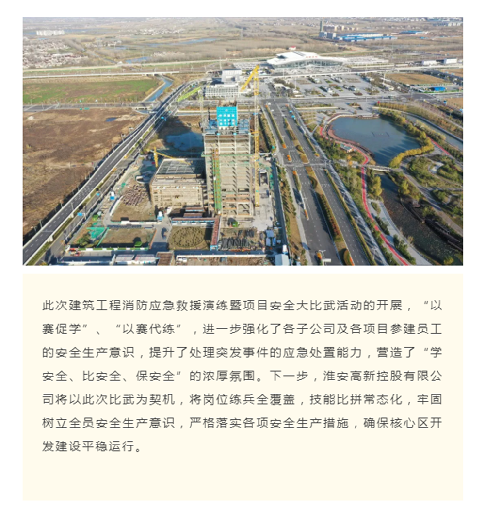 為貫徹落實(shí)“人民至上,生命至上”的新安全發(fā)展理念,進(jìn)一步推動(dòng)高鐵商務(wù)區開(kāi)發(fā)建設安全生產(chǎn)形勢穩定發(fā)展,結合淮安生態(tài)文旅區“兩在兩同”建新功活動(dòng)要求,11月30日上午,淮安高新控股有限公司組織專(zhuān)職消防站、各子公司以及在建各項目開(kāi)展建筑工程消防應急救援演練暨項目安全大比武活動(dòng)。 ★ 賽前,公司副總經(jīng)理朱國忠在開(kāi)幕致辭中表示:希望我們能夠以此次安全大比武活動(dòng)為契機,把安全生產(chǎn)的思想貫穿于每個(gè)管理人員和每一個(gè)工人的工作中。 消防知識講解 活動(dòng)開(kāi)始前,各在建項目組織了安全知識競賽,參加比武的選手均是競賽的優(yōu)勝者?;顒?dòng)中,首先由高鐵商務(wù)區專(zhuān)職消防站進(jìn)行講解和演練,消防隊員精彩地講解演練了消防車(chē)單車(chē)雙槍操作、應急救助聯(lián)動(dòng)、干粉滅火器使用等內容,專(zhuān)業(yè)的實(shí)操講解贏(yíng)得大家陣陣掌聲。